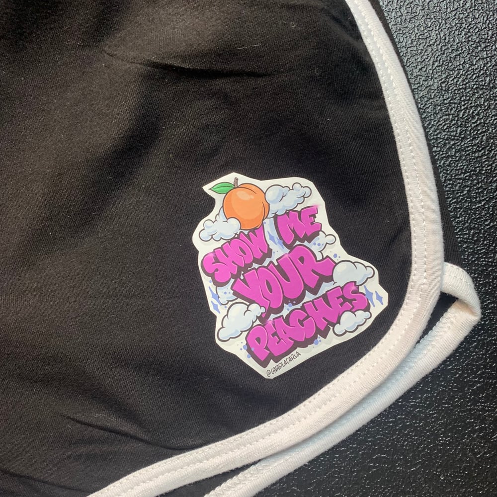 Featuring show me your peaches logo on front left ; peach with wings logo on back side
