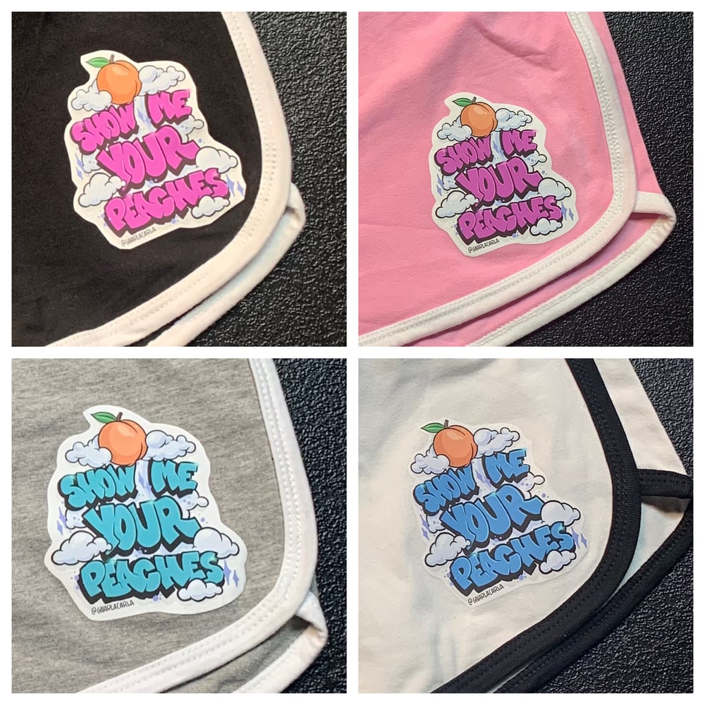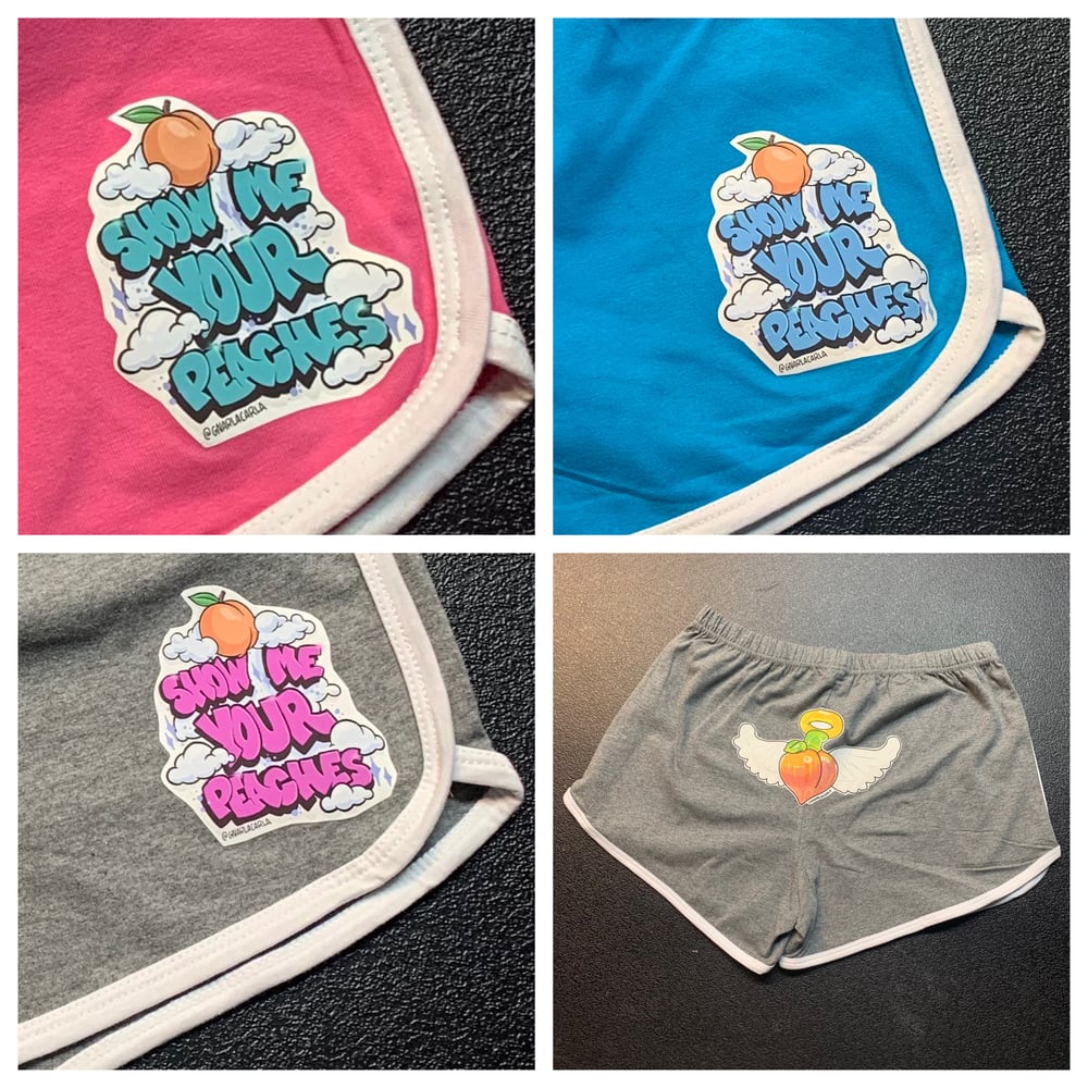 Featuring show me your peaches logo on front left ; peach with wings logo on back side
